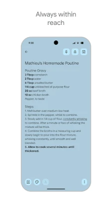 Vos informations essentielles voyagent avec vous, synchronisées et accessibles sur tous vos appareils. Que vous soyez sur votre téléphone, votre tablette, votre ordinateur ou votre montre connectée Wear OS, Google Keep assure une continuité parfaite de votre expérience. Chaque modification est immédiatement reflétée partout, vous garantissant un accès constant à vos données à jour. Plus intelligent encore, définissez des rappels géolocalisés pour que, par exemple, votre liste de tâches s'affiche automatiquement lorsque vous atteignez un lieu spécifique, vous offrant la bonne information, au bon moment, sans effort supplémentaire.