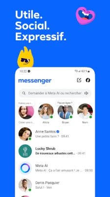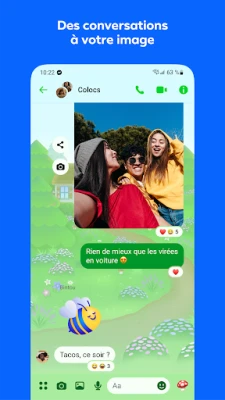 Messenger : l'application de messagerie gratuite pour rester connecté. Communiquez avec vos proches, explorez vos centres d'intérêt et développez votre communauté. Exprimez-vous et partagez vos émotions au-delà des mots, où que vous soyez. Tout ce dont vous avez besoin pour des échanges riches.