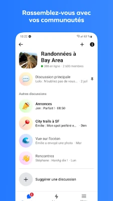 Rassemblez-vous et tissez des liens plus forts avec les communautés qui vous passionnent. Que ce soit pour votre école, votre quartier ou des groupes d'intérêt spécifiques, Messenger facilite une communication pertinente et un sentiment d'appartenance. De plus, plongez au cœur de l'univers de vos créateurs préférés en rejoignant leurs canaux de diffusion dédiés. Accédez à du contenu authentique et informel, restez informé de leurs dernières actualités et connectez-vous d'une manière plus intime avec ceux qui inspirent votre quotidien.