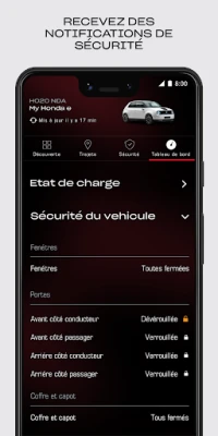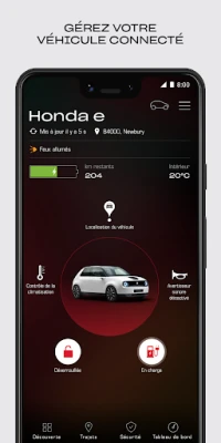 Au-delà de la conduite, My Honda+ veille sur votre tranquillité d'esprit et le bien-être de votre Honda. Restez informé de la sécurité de votre véhicule grâce à des alertes instantanées en cas d'ouverture non autorisée de portes ou de fenêtres. Verrouillez et déverrouillez votre voiture à distance, où que vous soyez. Accédez à des rapports complets sur l'état de santé de votre véhicule et gérez les vérifications nécessaires. Pour les propriétaires de véhicules électriques ou hybrides rechargeables, contrôlez et programmez à distance la climatisation et la recharge pour un confort optimal. Ne perdez plus jamais votre Honda de vue grâce au localisateur intégré sur carte et délimitez des périmètres de géo-clôture pour être averti si votre véhicule quitte une zone définie.
